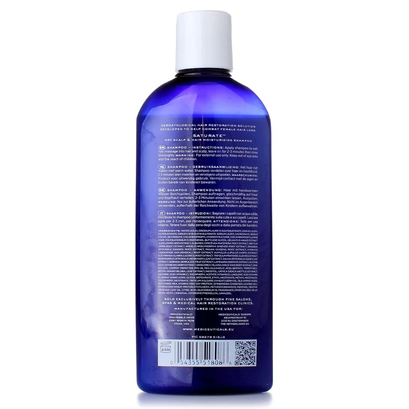 De Mediceuticals Saturate Shampoo is een intens hydraterende shampoo die speciaal is ontwikkeld voor droog en stug haar en een droge hoofdhuid. De formule helpt het vochtgehalte van haar en hoofdhuid te herstellen voor een zacht, soepel en gezond resultaat.