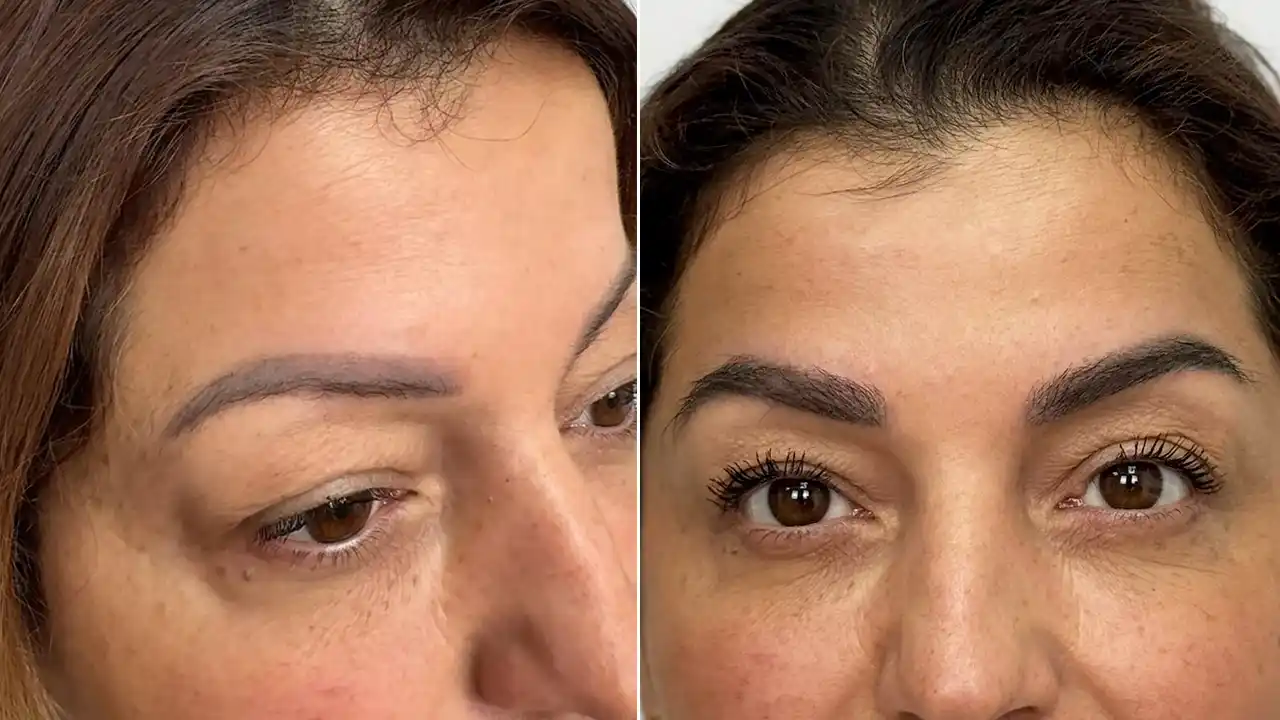 Deze voor en na resultaten tonen de uitkomst van een wenkbrauwtransplantatie uitgevoerd met de DHI-methode. Bij deze techniek worden individuele haarfollikels met een speciale DHI-implanter direct en nauwkeurig in het wenkbrauwgebied geplaatst. Hierbij wordt de natuurlijke haargroeirichting en vorm van de wenkbrauwen strikt gevolgd.