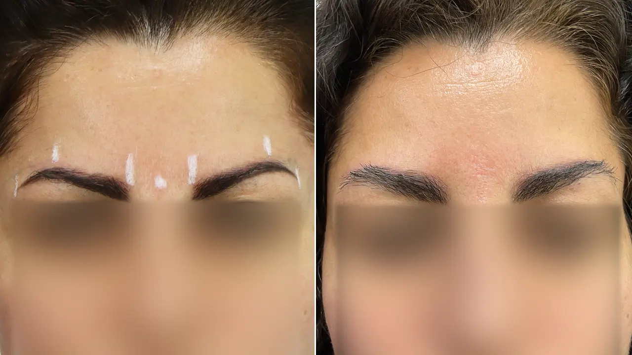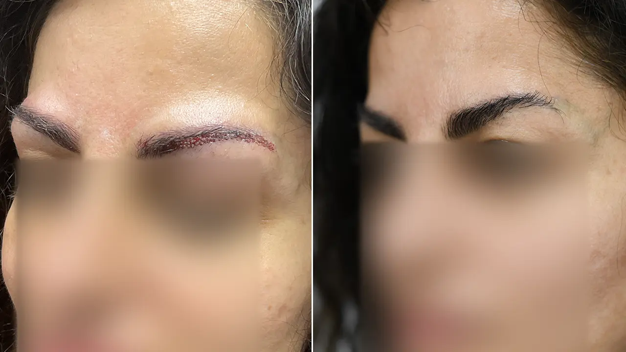 Deze voor en na resultaten tonen de uitkomst van een wenkbrauwtransplantatie uitgevoerd met de DHI-methode. Bij deze techniek worden individuele haarfollikels met een speciale DHI-implanter direct en nauwkeurig in het wenkbrauwgebied geplaatst. Hierbij wordt de natuurlijke haargroeirichting en vorm van de wenkbrauwen strikt gevolgd.